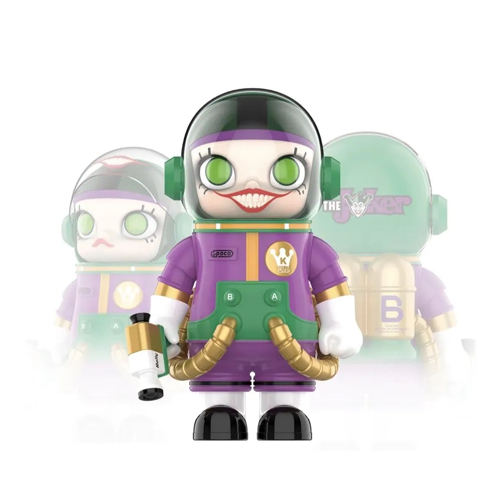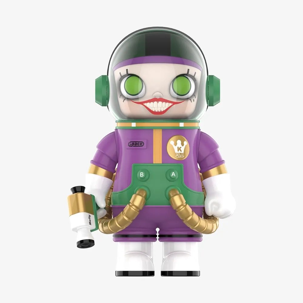 The design draws inspiration from the Joker’s wild persona, likely featuring his signature green hair, purple suit, and sinister grin, reimagined through Molly’s playful lens. Cosmic accents, such as a translucent helmet or starry details, may add a galactic twist, tying into the Space Molly theme. This toy captures the essence of the Joker’s chaotic charisma while maintaining Molly’s cool-cute vibe, making it a nostalgic yet fresh addition for fans of DC Comics and designer toys. It’s more than a toy—it’s a bold fusion of pop culture icons, celebrating creativity and rebellion in a collectible form.